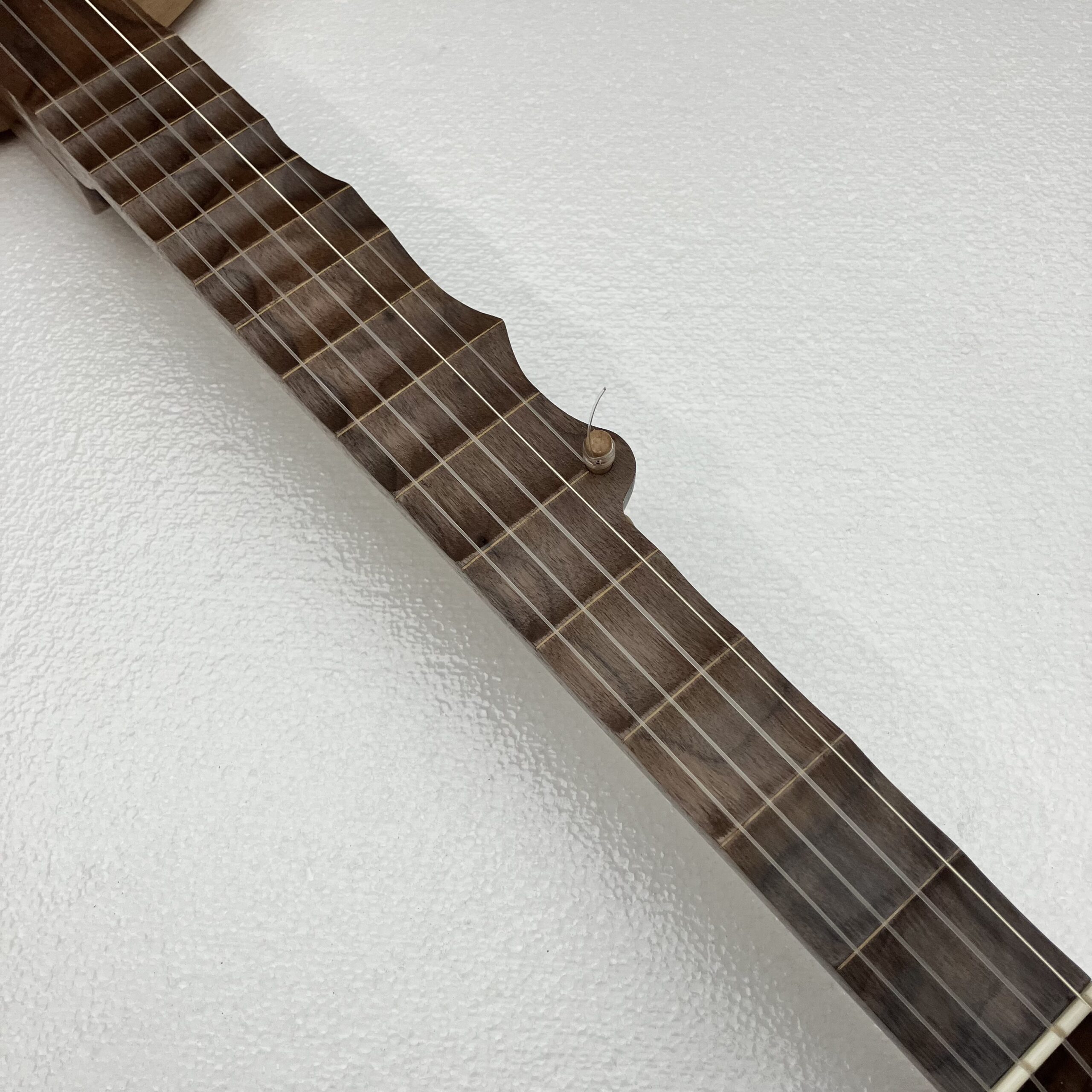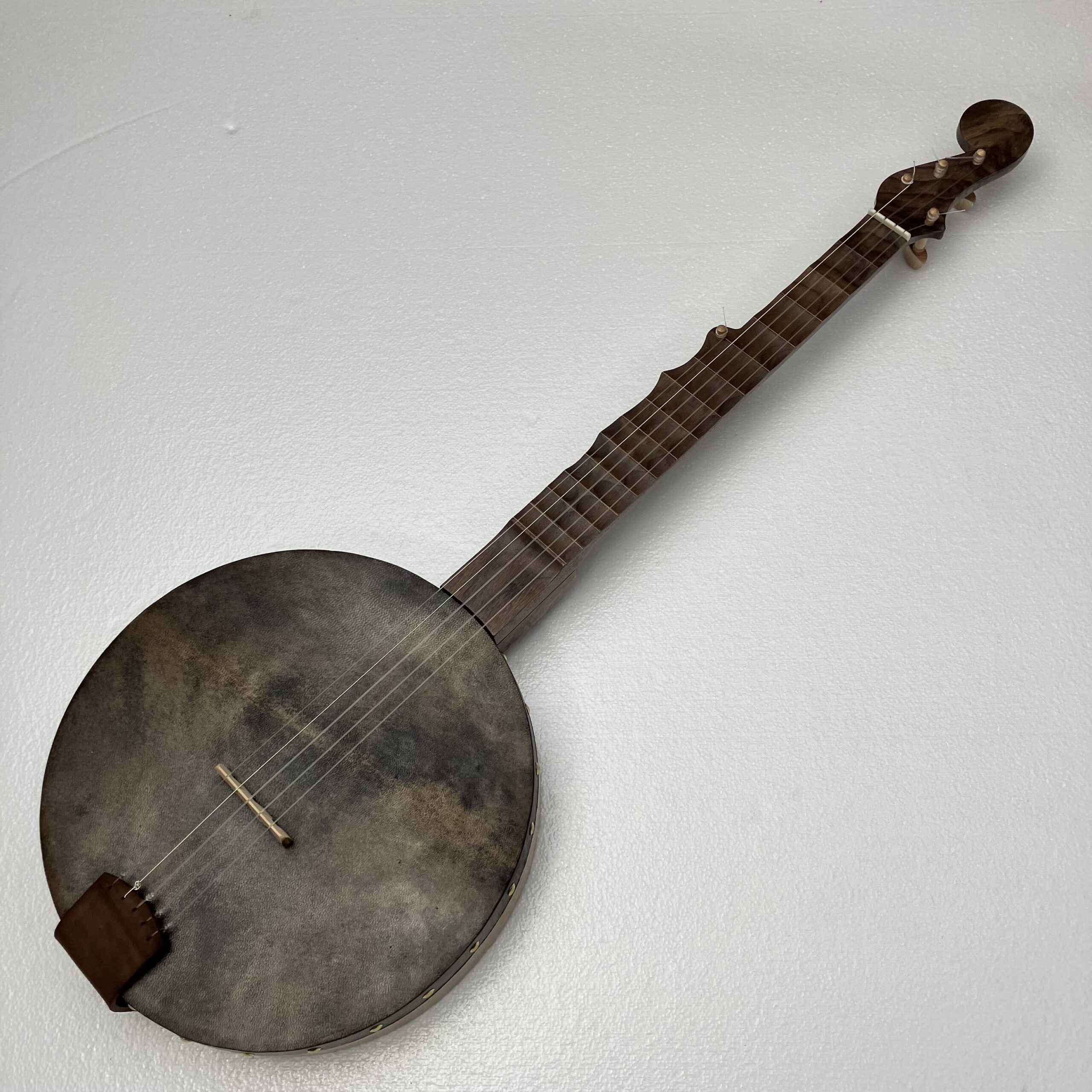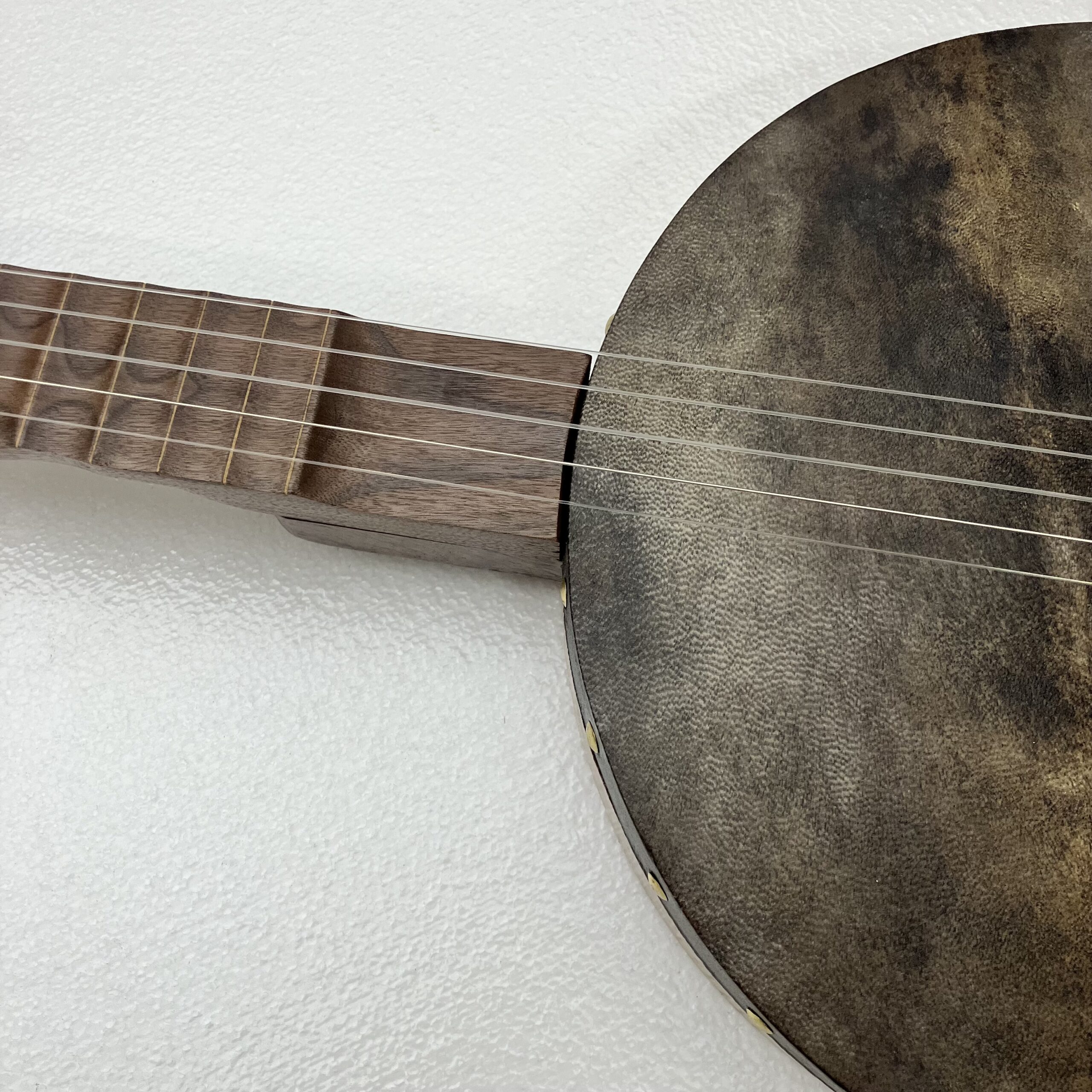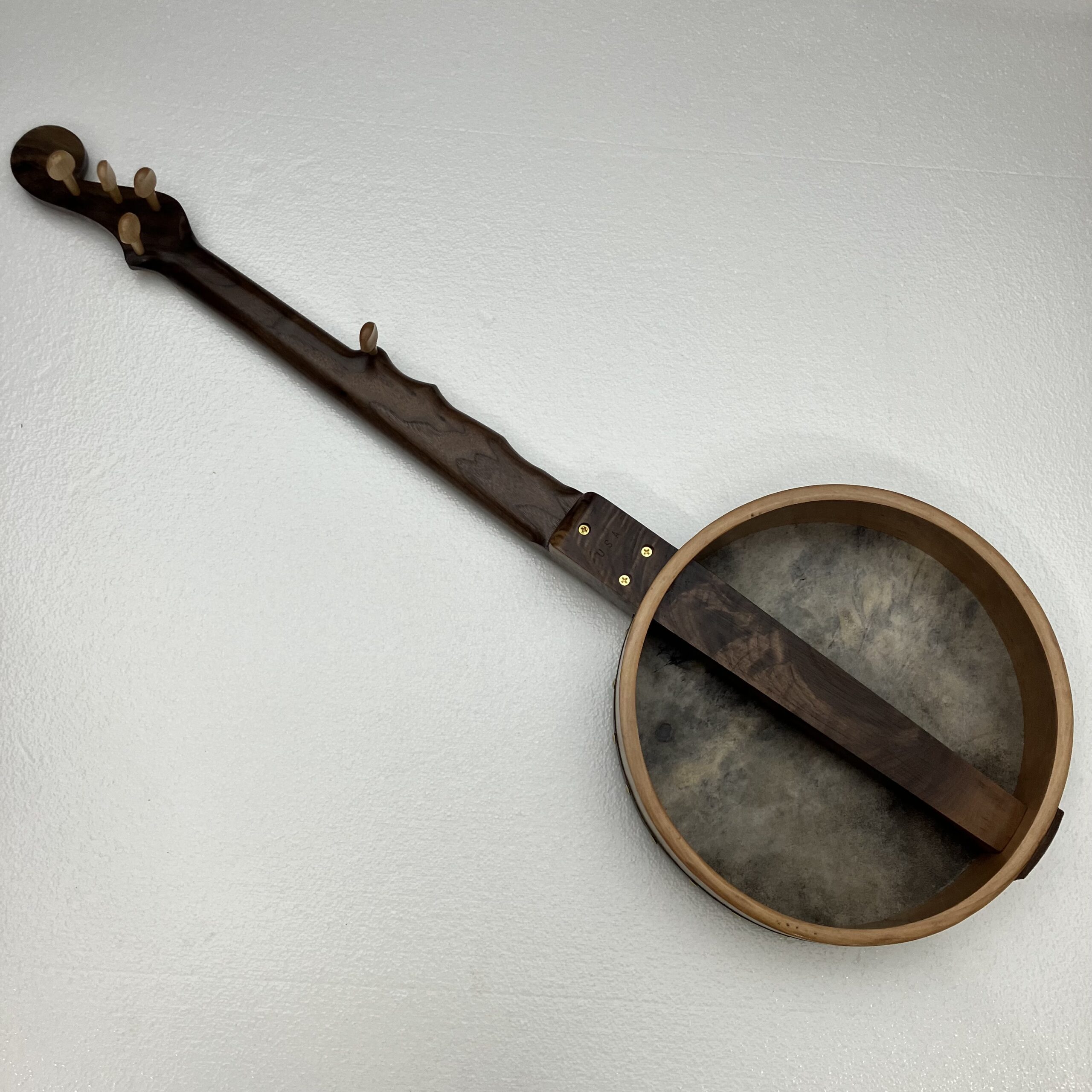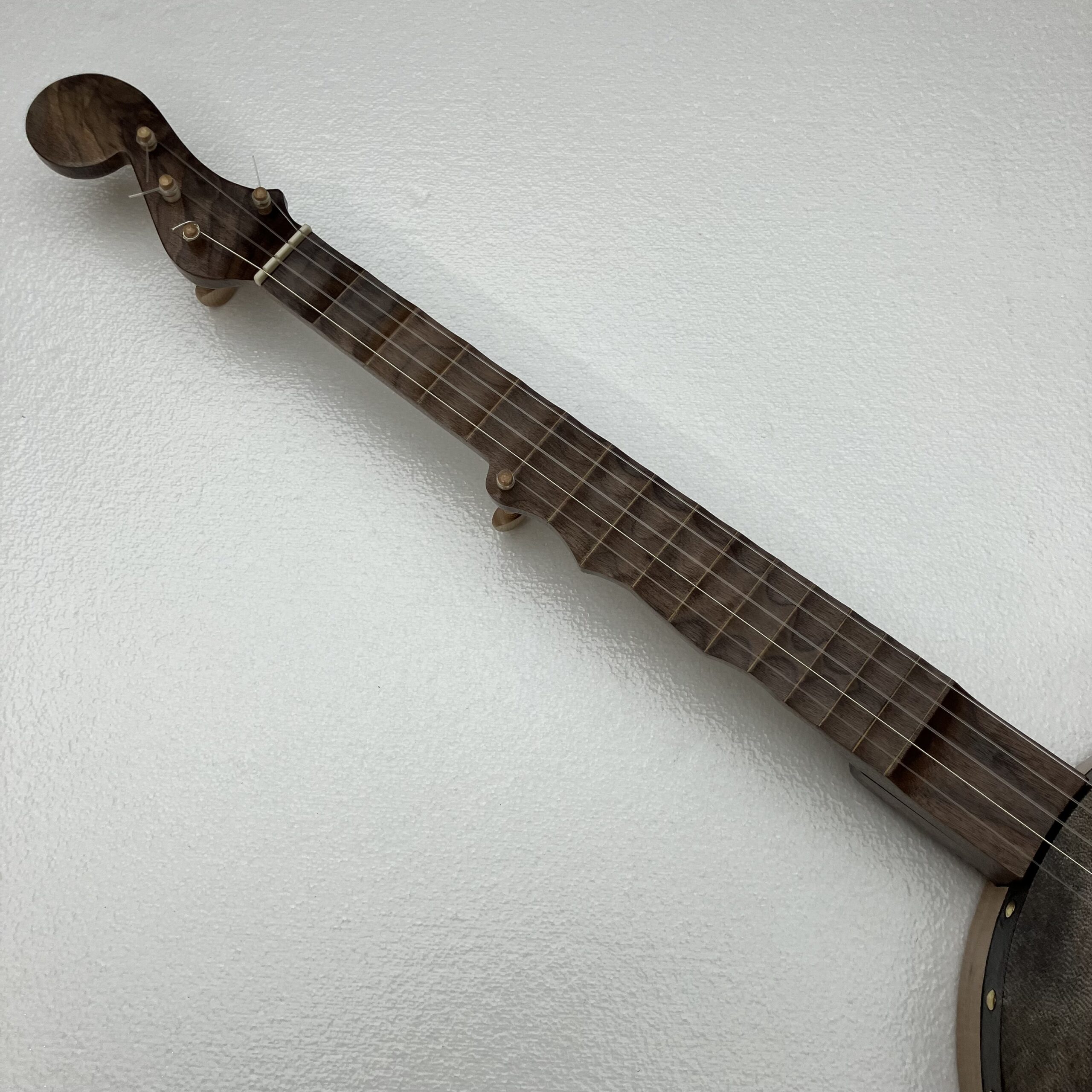 I’ve made a few partially scalloped neck banjos in the past and they played very well so I’ve decided to take it a step further. This may be the only fully scalloped minstrel banjo in existence. The scallops function almost the same as frets but allow the expressive nature of a fretless fingerboard to shine through. You can “fret” full chords and they will ring true. Also, fret slots are cut into the fingerboard and filled with a contrasting wood filler for further visual aid on the fret positions.