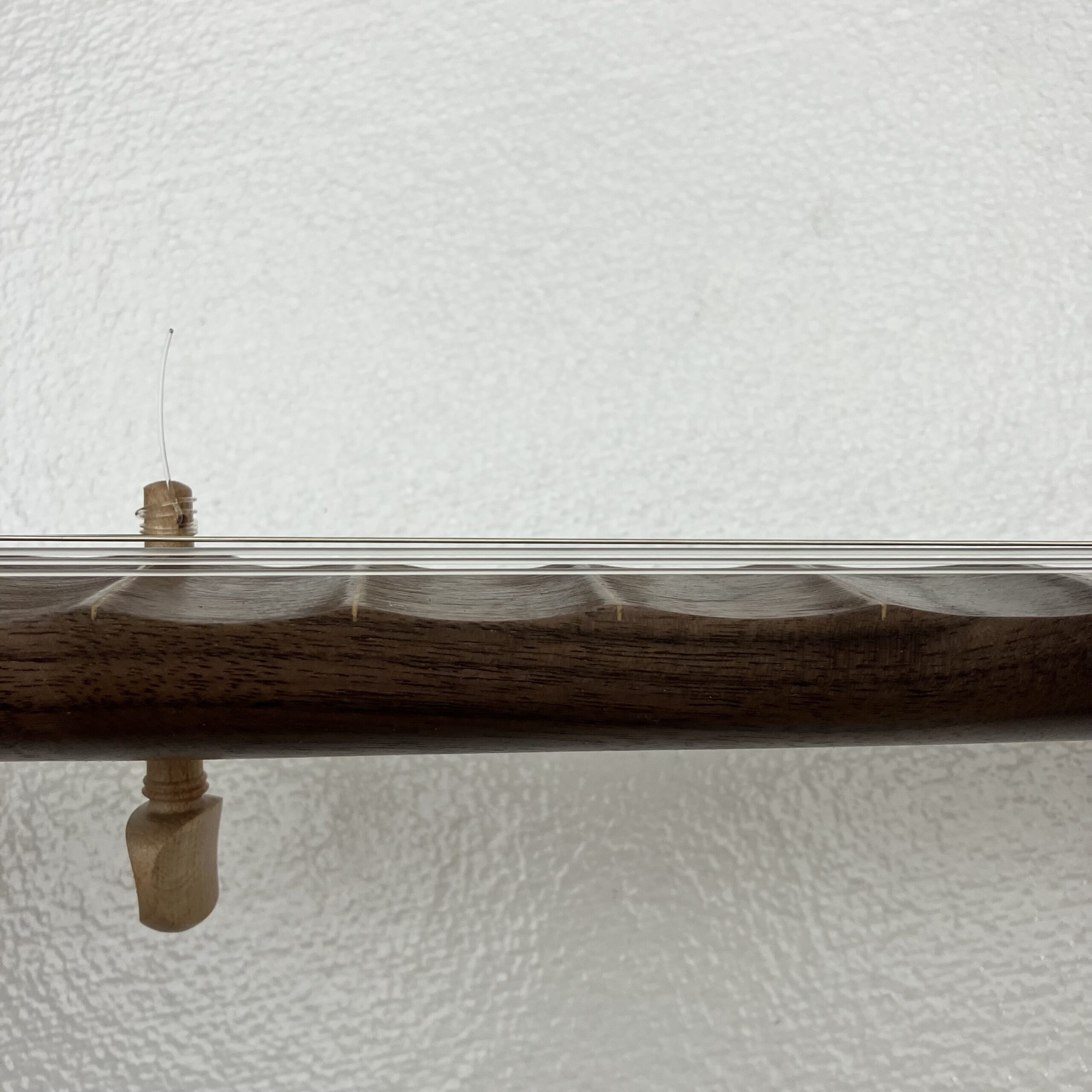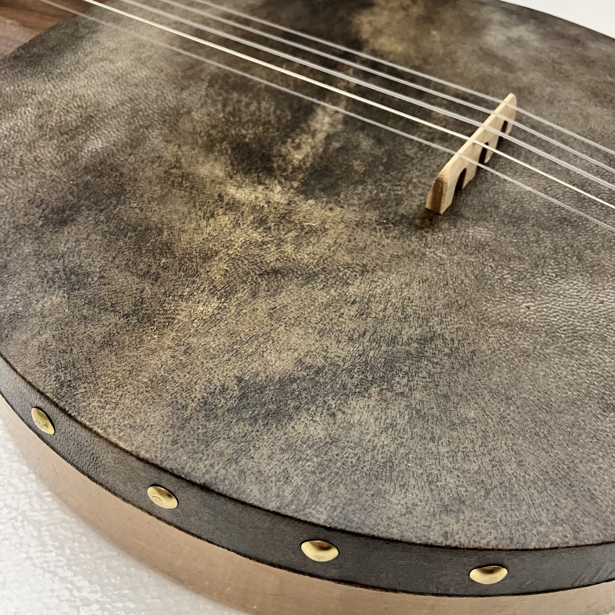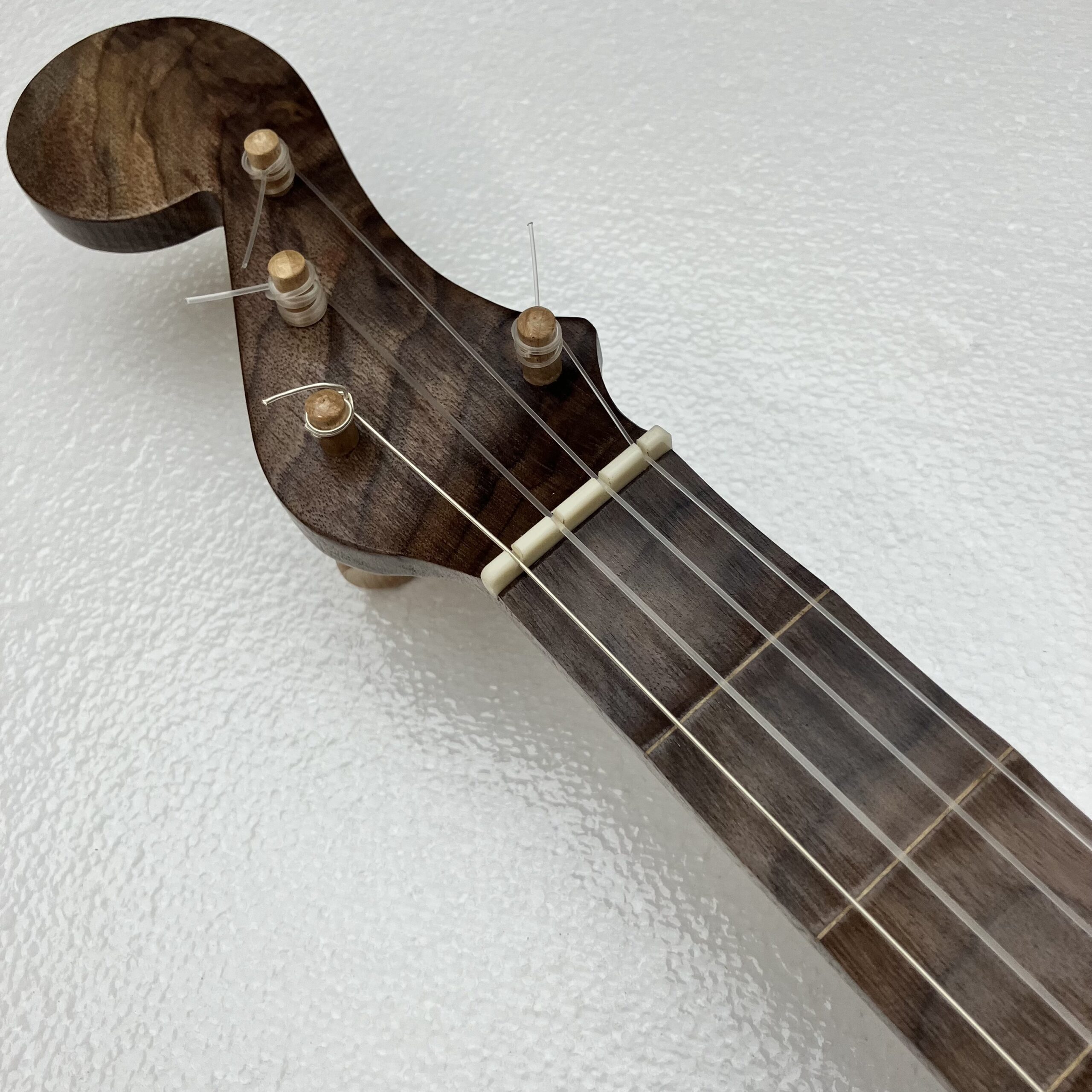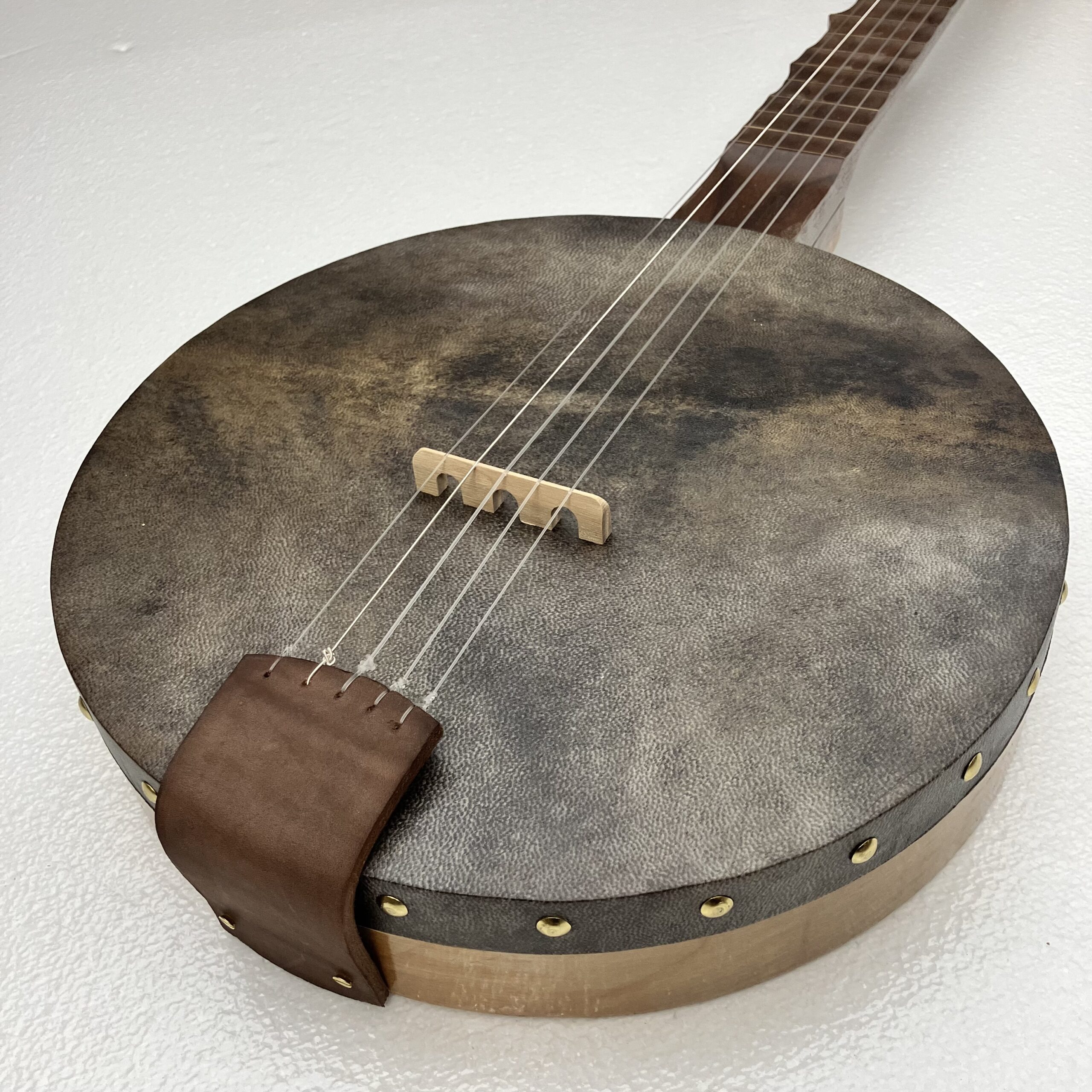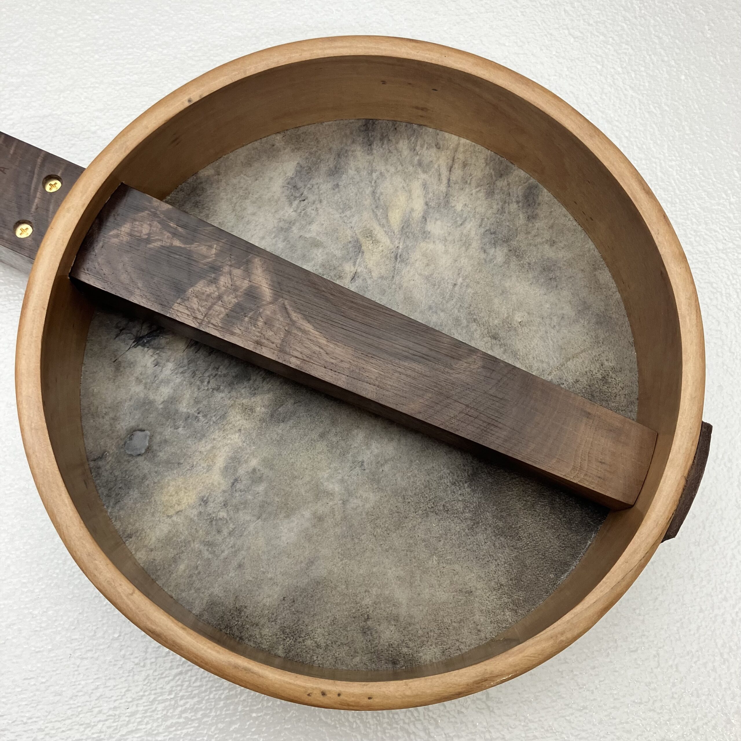 I’ve made a few partially scalloped neck banjos in the past and they played very well so I’ve decided to take it a step further. This may be the only fully scalloped minstrel banjo in existence. The scallops function almost the same as frets but allow the expressive nature of a fretless fingerboard to shine through. You can “fret” full chords and they will ring true. Also, fret slots are cut into the fingerboard and filled with a contrasting wood filler for further visual aid on the fret positions.